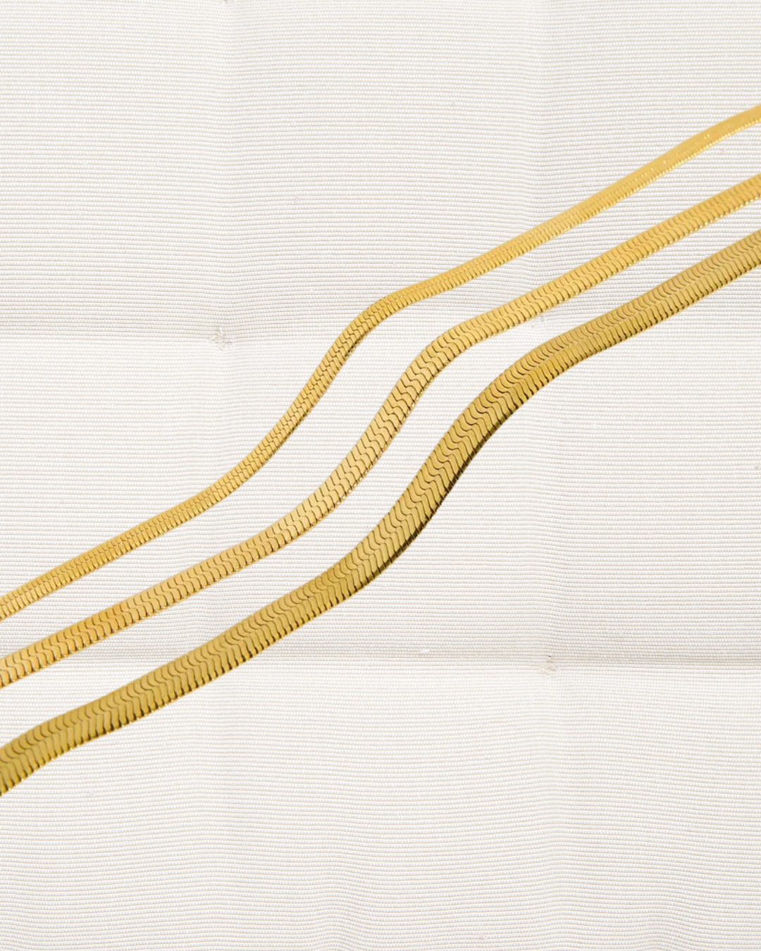 This gold-plated herringbone necklace combines edgy style with elegant simplicity. Available in three sizes—3mm, 4mm, and 5mm—it offers versatile layering options or a bold standalone statement. Its sleek, flat links lie smoothly against the skin, reflecting light beautifully for a polished look suitable for any occasion.