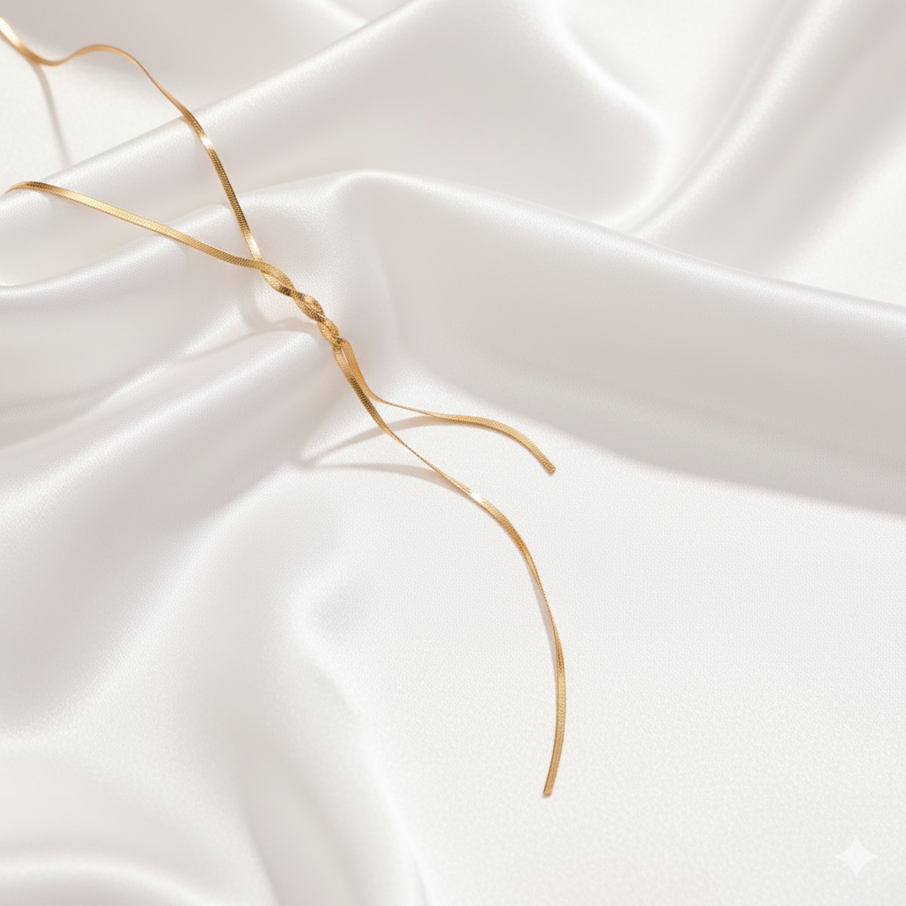 This 18k gold-plated herringbone snake long hanging necklace delivers an elegant and striking look, ideal for a night out. Its smooth, serpentine design drapes beautifully, adding a touch of refined sophistication and modern edge to any evening ensemble.