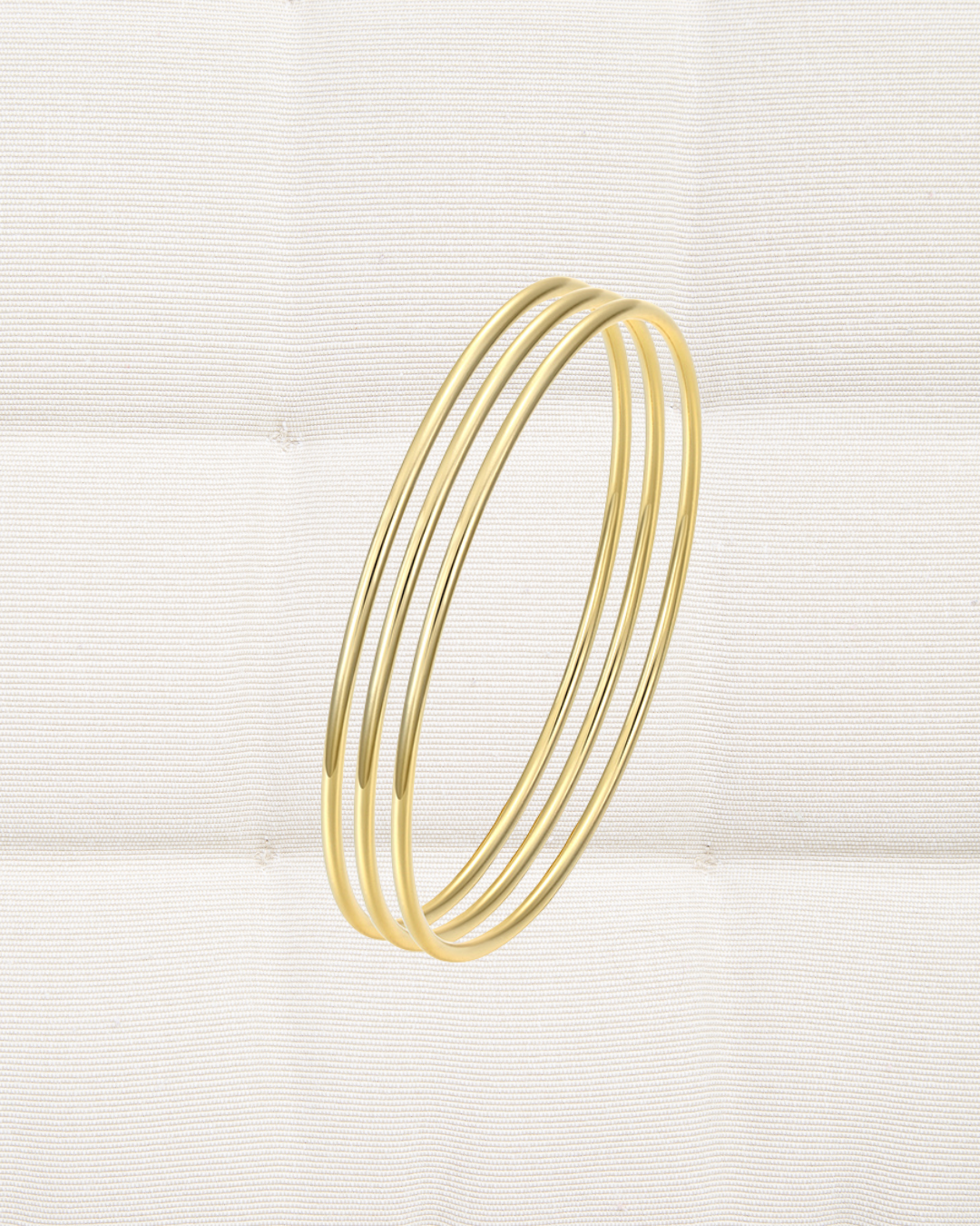 The Triple Bangle offers understated sophistication with three gracefully stacked bangles in gold plating. This minimalist design provides versatility for layering or wearing as a complete set, making it an essential everyday piece. The smooth, polished finish reflects quality craftsmanship while maintaining a clean aesthetic that pairs effortlessly with any wardrobe. Durable and timeless, this bangle set delivers refined elegance without unnecessary embellishment.